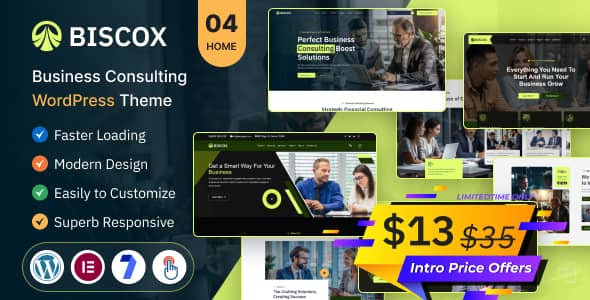 Biscox is a responsive and versatile WordPress theme, perfect for consulting firms, financial advisors, insurance agencies, and corporate businesses. Built with the Elementor page builder, it offers a simple drag-and-drop interface, allowing you to create a professional website without coding skills. Biscox blends modern design with the latest web technologies, making it ideal for showcasing business services and enhancing user experience.