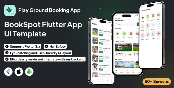 The BookSpot app UI Template is a modern and sleek design for booking playgrounds online. It’s made with Flutter 3.x, making it easy to customize for creating beautiful apps on both Android and iOS platforms.
