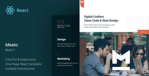 Meelo is react one page template perfect for business agency website. It comes with great UI/UX and is easily customized. It is made with the latest technologies for React templates, fancy user interface, responsive layout, routing functionality, and many more awesome features.