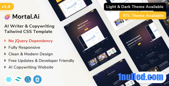 Mortal.Ai is a responsive React Js template for AI writers and copywriting websites. We have designed this template for your new AI Content Writing website just how you like it. So, if you want to create a website for Writing Blog Content, Digital Ad Copy, Technical Writing, SEO Content, Landing Page Copy, Social Media content, Email Marketing, Website Copy, Marketing Copy, e-commerce Copy, Product Description, and Email Marketing then Mortal.Ai Reactjs + Tailwind CSS template will best choice to build your own website.