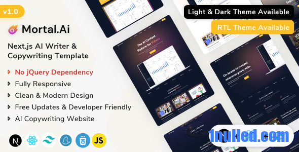 Mortal.Ai is a responsive Next js template for AI writers and copywriting websites. We have designed this template for your new AI Content Writing website just how you like it. So, if you want to create a website for Writing Blog Content, Digital Ad Copy, Technical Writing, SEO Content, Landing Page Copy, Social Media content, Email Marketing, Website Copy, Marketing Copy, e-commerce Copy, Product Description, and Email Marketing then Mortal.Ai Next js template will best choice to build your own website.