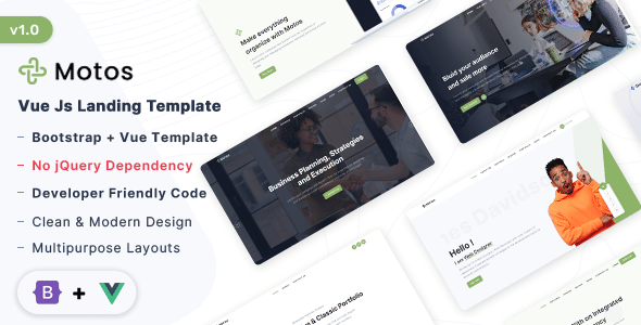 Motos is a Vue js Multipurpose landing page template. It is a modern, simple, and responsive template. This layout has clean features and a modern and unique style, and it will make your website modern. A landing page for your business, agencies, personal, portfolios, marketing, apps, saas, etc. Motos vue includes 12 files for multipurpose home applications. Because all the files are well-organized, we anticipate they will be simple to use and edit. This template is well-organized and quick to customize.