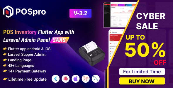 POSpro – POS Inventory Flutter App with Laravel Admin Panel is a cutting-edge Point of Sale (POS) solution delivered as a Software as a Service (SaaS) application. Developed using the Flutter (App) and Laravel (Admin Panel) frameworks for a seamless cross-platform experience, it integrates effortlessly with existing POS systems to provide a robust and scalable backend.
