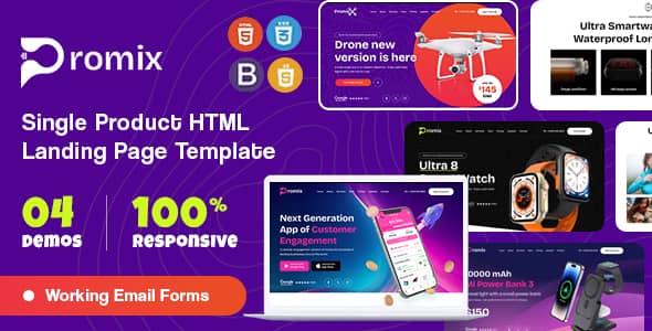 Promix – Single Product HTML Landing Page Template. It’s the right layout if you want to promote your products with their features. A single product page is a perfect way to focus on one particular thing. We are presenting 4 pre-built professional demos. By using this templates you can present any kind of your product. It is suitable for any kind of product landing business like digital product landing, drone, Smartwatch, Power Bank, Mobile App, Headphone, CCTV Camera, Multipurpose, retail, use for any kind of electronics Product. It is responsive, easy to customize, and highly flexible.