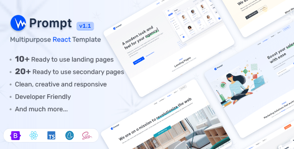 Prompt is a fully-featured modern multi-purpose template built on top of awesome React and Bootstrap 5.1.3. It’s for building responsive, mobile-first landing pages, websites with Bootstrap. The clean and well-commented code allows you to easily customize it. You can simply update its contents, images, and scss according to your company info. Prompt has 10 different types of landings, which are quite enough for your business.