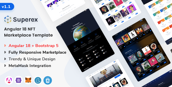 Superex is a Powerful Angular 17 NFTs marketplace template. Superex is a fully responsive, pixel-perfect, and complete template for NFTs, crypto-collectibles, digital items, non-fungible tokens websites, MetaMask Integration, and more. Superex is a functional components-based Angular JS template.