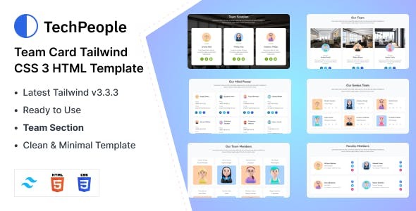 TechPeople – Team Cards Tailwind CSS 3 HTML Template, the ultimate Team Member Layout! Crafted with Pure HTML and CSS, this sleek and responsive design offers 12 stunning styles to choose from. Effortlessly showcase your team or project with ease and sophistication. Experience easy customization and compatibility with tailwindcss components, making TechPeople the perfect choice for your web project. Don’t miss out on this remarkable team showcase – elevate your website today! Customization is a breeze with its developer-friendly code and component-based design, perfect for various agencies and businesses. Integrating the animation is seamless; just copy the code from the source file, including HTML and Tailwind CSS.