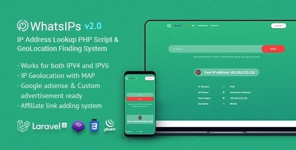 WhatsIPs | IP Address Lookup PHP Script Nulled Free Download. WhatsIPs is an IP Address Lookup PHP Laravel Script and IP Address Based Geolocation Finding System. Free 50,000 Query Per Month. It’s works for both IPV4 and IPV6. The System also Shows the Location on Google Map, ISP Name, Hostname, Proxy Information, Continent, Country and Region Information, Latitude and Longitude, and more.